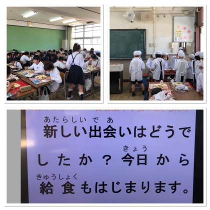 今年度初めての給食です。みんな美味しそうに食べていました。6年生は廊下で元気な声でおかわりのジャンケンをしています。勝っても負けても楽しそうでうれしそうなのです。違う学年ではおかわりの人〜の声に長蛇の列です。