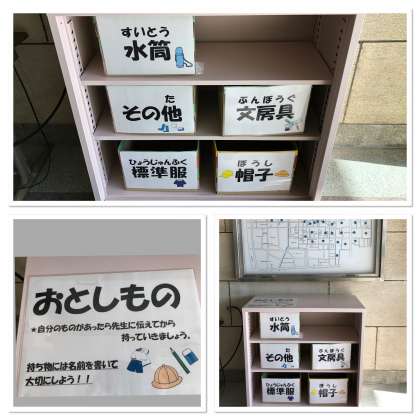落し物箱がきれいになりました。管理作業員さんがペンキを塗って、スクールサポーターさんが箱を美しくしてくれました。それぞれに分けられてもいます。