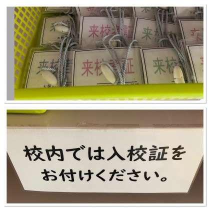 本校に来られた時は保護者の皆さんは必ず入校証を付けていただいています。