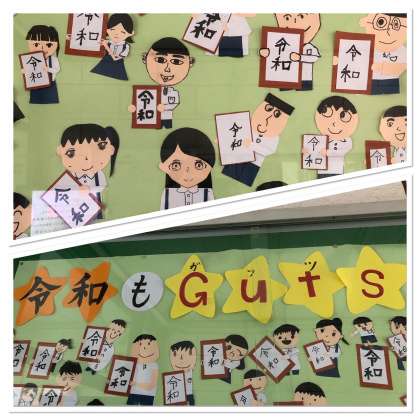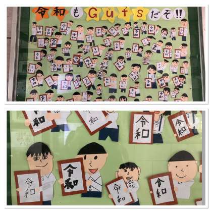 5月の玄関掲示は、5年生です。新しい元号をもっている姿を表現しました。顔の表情から、新しい気持ちでやるぞというのが伝わってきます。これから10年度、20年度、今の小学生が活躍する時代がやってきます。この玄関掲示のように、一人一人が自分を表現する場があるのは、とても素敵なことなのです。