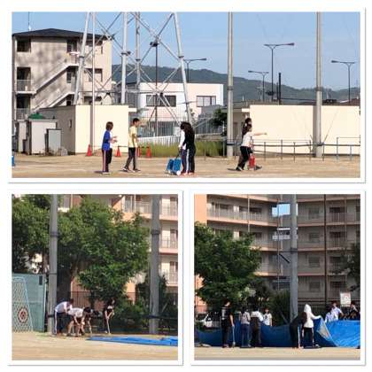 明日のスポーツテストに向けて、ソフトボール投げや50メートル走、立ち幅跳びの準備を先生方がしています。