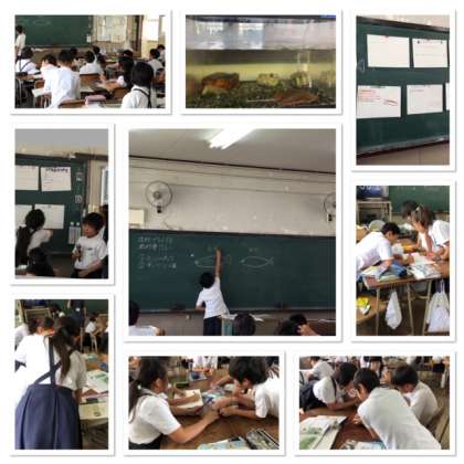 メダカのことを学習しています。メダカはオスとメスでは違います。その違いを確認してから、どうしたらメダカの命を大切にすることにつながるかを考えました。グループで教科書のメダカの飼い方を参考にして、まとめたり、意見を伝え合ったりしました。頭を付き合わせて協力して仕上げようとする子どもたちです。最後に魔法のマイクロフォンを使ってみんなに発表する場面もありました。