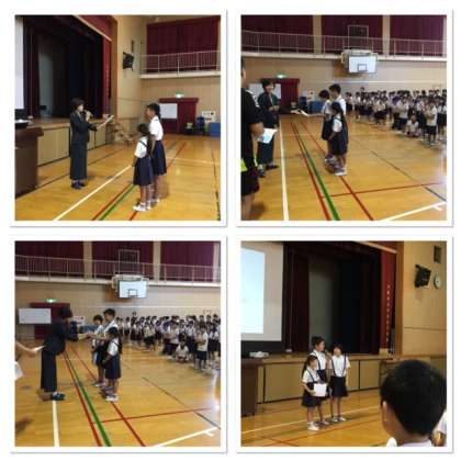 体育施設開放で学校を練習場所にしているバレーボールチームの表彰をしました。おめでとう。よく頑張りました。