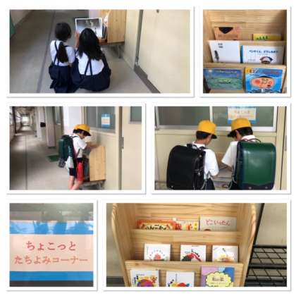 校長経営戦略予算で本棚を買いました。廊下のちょこっとしたところに絵本を並べています。管理作業員が置き台を作って、ちょこっと取りやすくしてくれました。本棚の近くの教室の先生が自分の持っている本を子どもたちに読んでほしいと並べてくれました。
