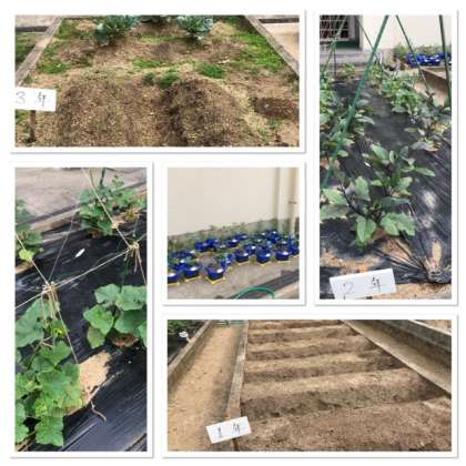 長吉東小学校の学習園はいろいろなものを栽培しています。それぞれの学年で耕し、種や苗を植え、大きくなるのを楽しみにしています。収穫の喜びを味わえますように。命を育てていることを感じている子どもたちです。