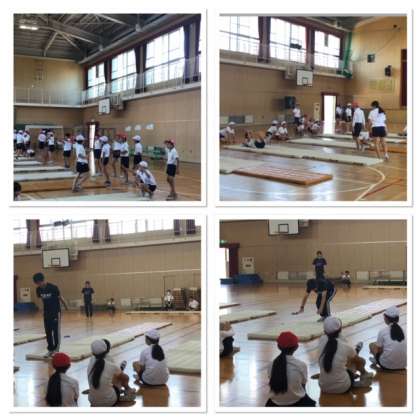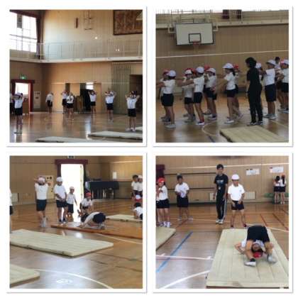 マット運動で連続技にチャレンジします。マットを並べて3つの技を入れました。