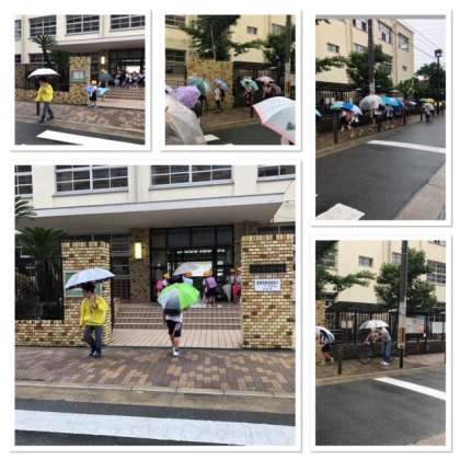 朝から雨が降っていました。そんな中でも見守り隊の方々が子どもに寄り添って登校してくださいます。