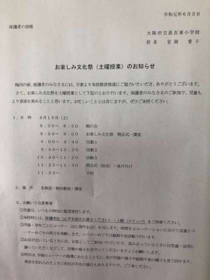 土曜授業の予定です。ぜひぜひみんながつくる、みんなの長吉東小学校にお越しください。