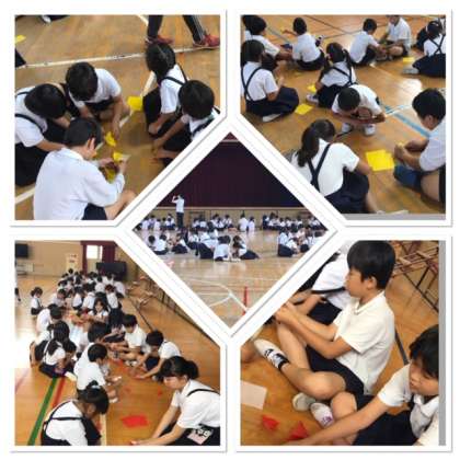 長吉東小学校のリーダーの6年生が1年生にツルの折り方を教えてくれました。とても優しいリーダーです。