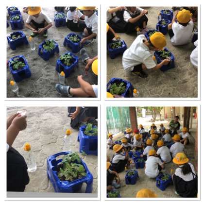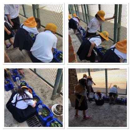 アサガオに水やりをしたり、栄養分をあげたりしています。大きくなったよ。と声をかけている優しい1年生です。