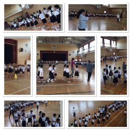 最初にゲストティーチャーできてくださった3人の方を紹介してから子どもたちは、かまえての声とともに、一生懸命に覚えて踊りました。そして、動きが覚えられたら円になってみんなで先生のかけ声とともに曲に合わせて踊り、楽しい時間をつくりました。