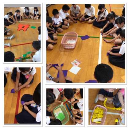 その後、縦割り班ごとに鶴を折りました。高学年が低学年に優しく教える姿が見られました。サポートしながも簡単なところは低学年に、難しいところは自分たちがと考えて折っている場面もありました。6年生はリーダーとして、鶴糸で通す役目も果たしてくれました。