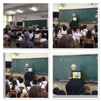 平野図書館から2年生の子どもたちにおはなしたからばこのプレゼンです。たくさんのお話をしてくださいました。じっくりと聞いている子どもたちです。