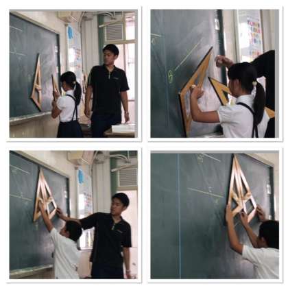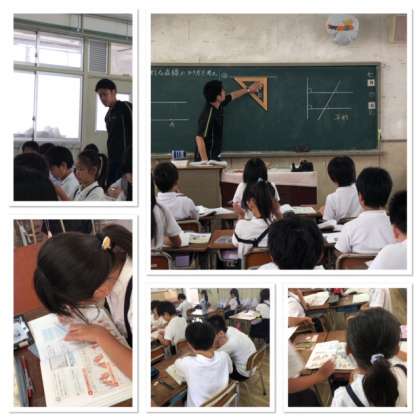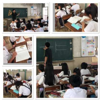 平行な線を三角定規を使って書くにはどうしたらいいかを考えました。二つのやり方を知りました。どうして三角定規を使ったら平行になるのかを考えながら、実際に教科書に書いてみました。最後には前に出て自分で書くように頑張りました。