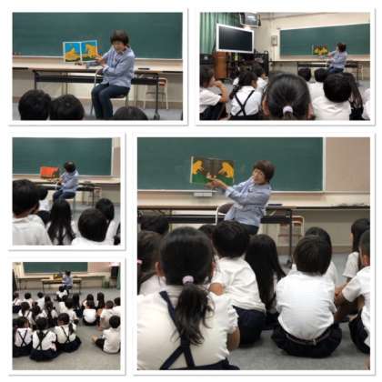 平野図書館から先生をお迎えして、一年生にお話会を開きました。いろいろな本を読んでくださり、本の世界に引き込まれます。