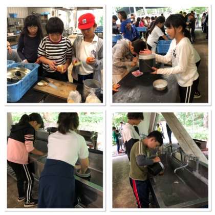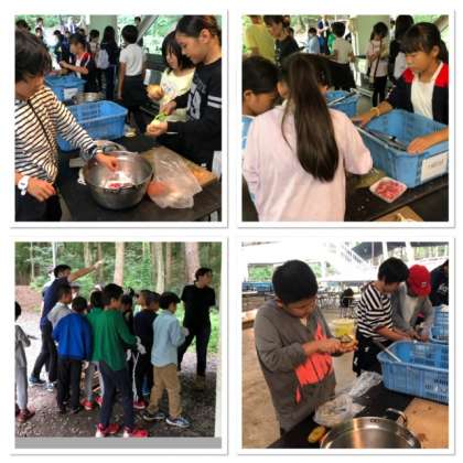 さあ、飯ごう炊さんが始まりました。みんなで協力して、野菜を切ったり、薪を組み立てたりしています。