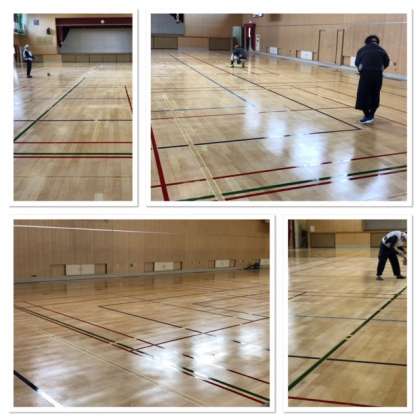 講堂の床がピカピカになりました。今日はラインを綺麗に直してくださっていました。暑い中、ありがとうございます。