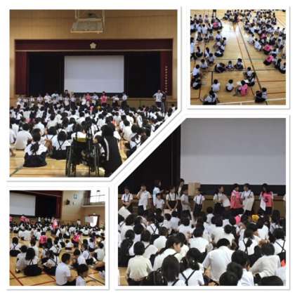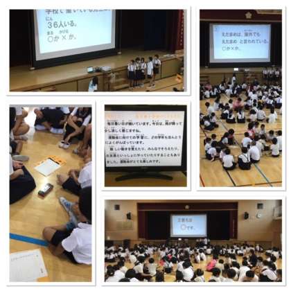 児童集会です。はじめにお習字の表彰を行いました。その後、マルバツクイズをしました。