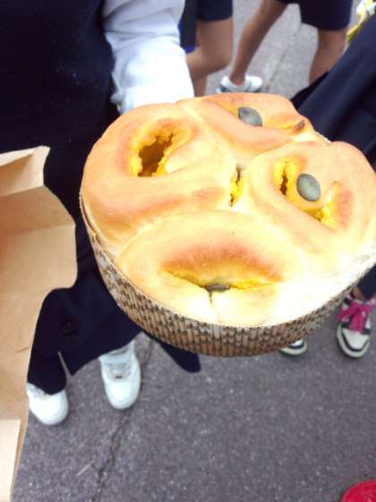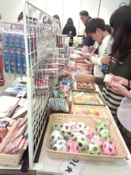 宿舎に到着し、お土産をえらんでいます。モクモクファームで作ったパンもお土産です。
