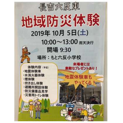 10月5日は、元長吉六反小学校で防災訓練が行われます。さまざまな体験コーナーとともに、防災グッズのプレゼントもあります。どうぞお揃いでお出かけくださり、今後の防災についてみんなで考える機会にしましょう。
