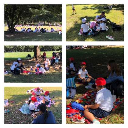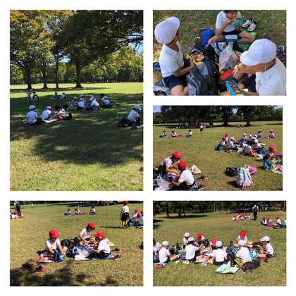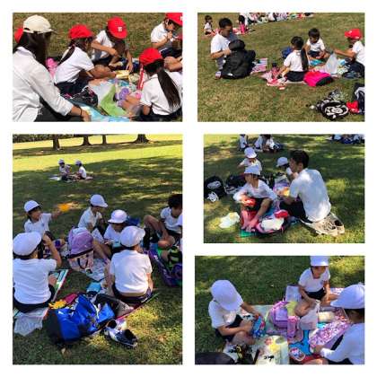 広い芝生の上で友だちと先生とみんなで食べるお弁当は、とてもおいしいです。