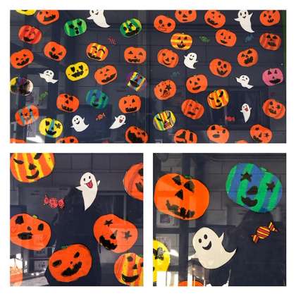 10月の玄関掲示はハロウィンでした。それに合わせて読書スポットに魔法使いの本がずらりと並びました。