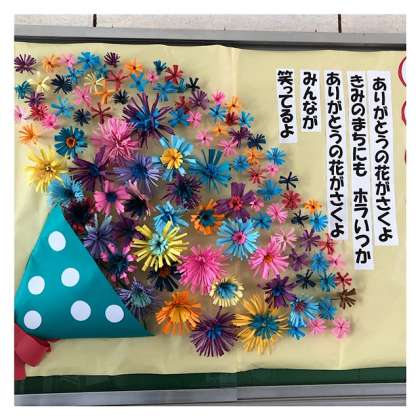 11月の玄関掲示です。5年生の作品です。一人一人の思いのこもった花が咲きました。この歌をご存知ですか?