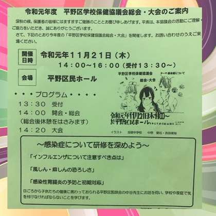 お知らせをしていました通り、本日11月21日2時から学校保健協議会が平野区民ホールで開かれます。