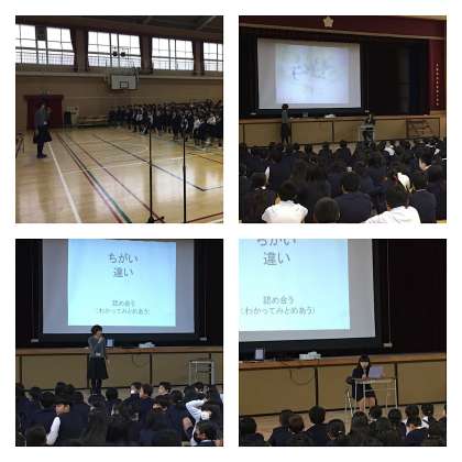 そして、金子みすずの「みんなちがって、みんないい」です。最後のフレーズ「みんなちがって、みんないい」は講堂中のみんなで言いました。