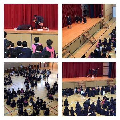 舞台の上で集会委員会が熱演をしました。それを縦割り班のみんなで考えます。卓球のシーンあり、魚釣りのシーンあり、なかなか面白かったです。