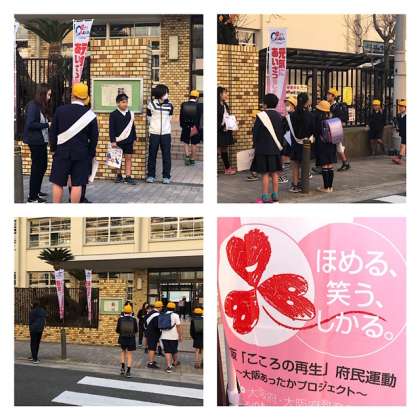 あいさつののぼりには「元気にあいさつしよう」と書かれています。そして心あったかプロジェクトとして、褒める・笑う・しかると3つのハートがありました。
