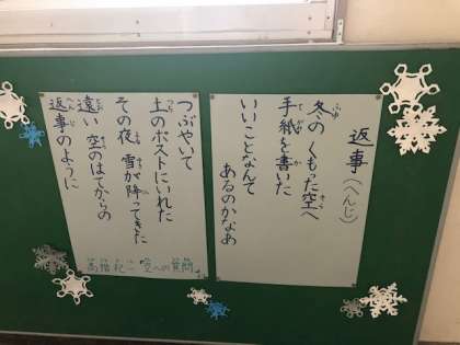 1月にふさわしい、ねずみ特集と、新年につながる本ばかりです。そして、図書室の前には、心があったかくなる詩がかざられています。ふと足を止め、詩を見たり、絵本を手にとったりする子どもたちです。