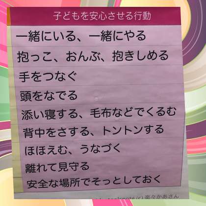 そのインクルーシブ推進室で、子どもを安心させる声かけ、安心させる行動と書かれたポスターを見つけました。この言葉や行動は、私たち大人もうれしいものです。