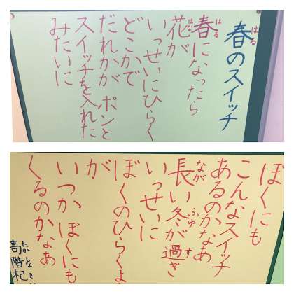 暦の上では今日から春。図書室の前には春のスイッチという詩が張ってありました。