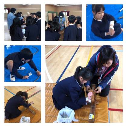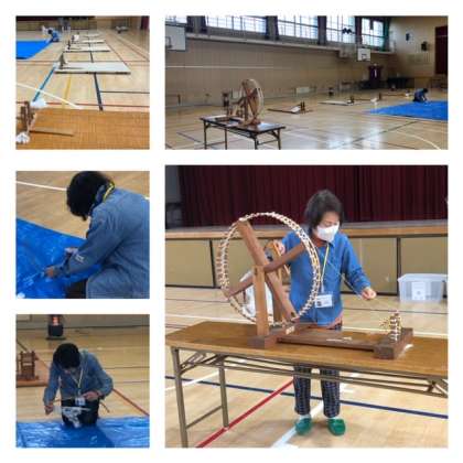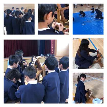 平野区役所から機械を借りて、わたから糸をつくりました。糸車を使って楽しそうに学習できました。
