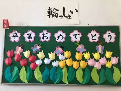 卒業おめでとうの文字と、きれいなチューリップがたくさん咲きました。