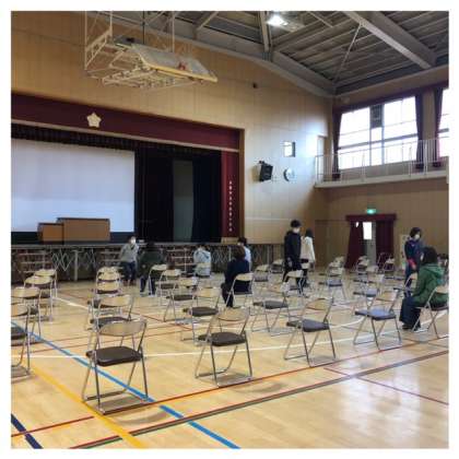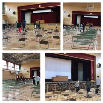 講堂には、感染防止の一助として今回は、1人用のパイプ椅子に卒業生が座ります。きちんと揃え、当日だけしか卒業式に向けての学習ができない卒業生がどこに座るかをわかるようにしました。