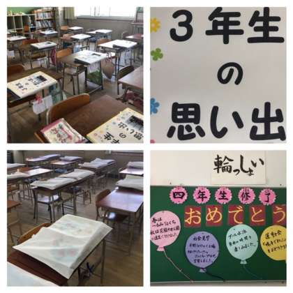 そして、机の上には思い出の品が並びます。黒板にはメッセージがありました。