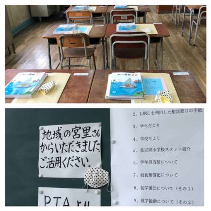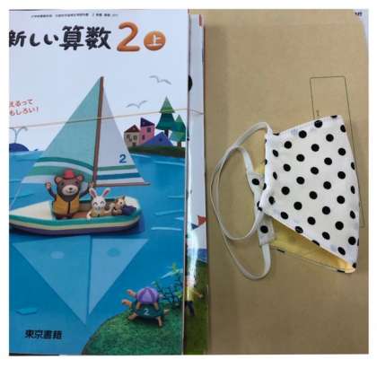 先日、地域の宮里さんからいただいたマスクを、この2日間の教科書配付日にお渡しします。