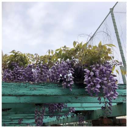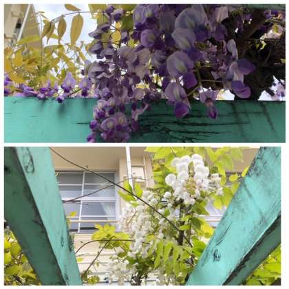 きれいな藤の花が満開です。藤の花の下を歩くと、元気な気持ちになります。