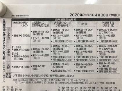 学校休業が10日まで延期となりましたが、大阪府から、このまま休校が続いたときにどのように授業時間を確保するのか想定したものが公表されました。ご覧ください。
