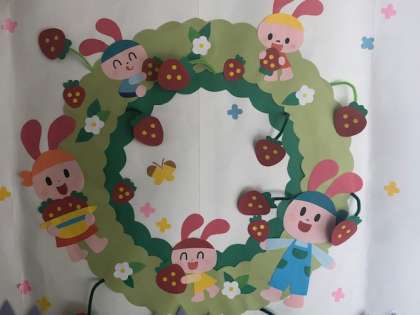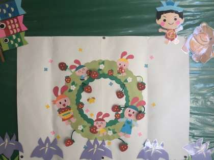給食調理員チームが、給食室の前に五月の掲示をかざりました。