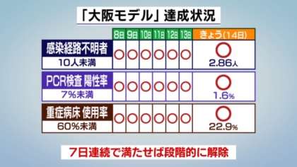 大阪府は、「大阪モデル」を14日まで7日連続でクリアしたため、段階的に解除することが決まりました。感染リスクが低い施設を対象とし、16日午前0時から実施されます。業態別の感染防止マニュアルも策定されました。少しホッとしました。