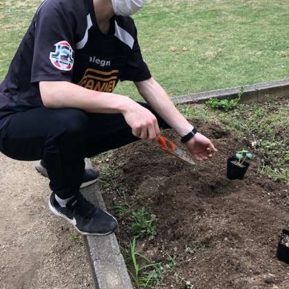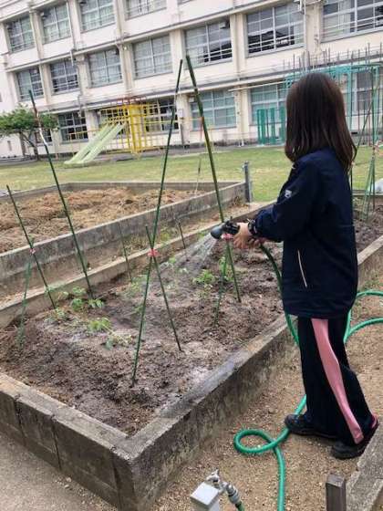 2年生の先生たちで、1つずつ心をこめて、たいせつにうえたよ。
