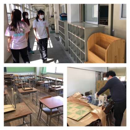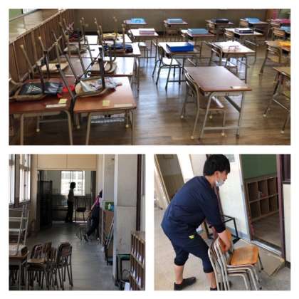 6月1日からの学校再開に備えて、1年生から3年生が3分割になります。その教室を教職員で準備しました。