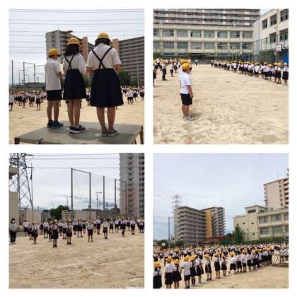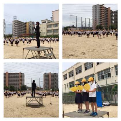 学校長からは、ようやく1学期の始業式が迎えられたことのうれしさ。今日からスタートすること。でもいつもと違い、この運動場に広がって並んでいる。今までとは違う。新しく、楽しんで、長吉東小学校を自分が作りましょう。という話がありました。