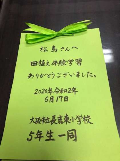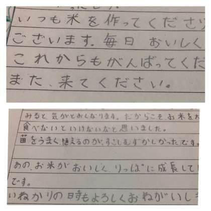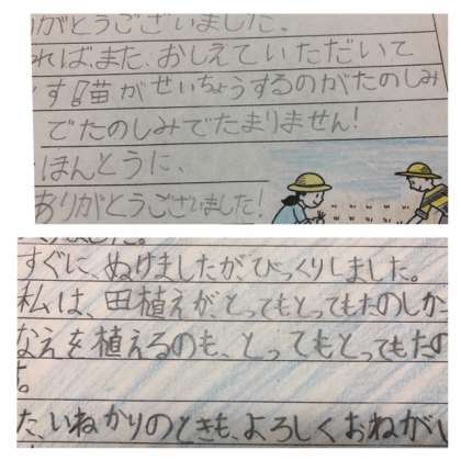 本当に、よい経験をありがとうございました。今後ともよろしくお願いします。子どもたちは、また稲刈りの時に来ていただくのを心待ちにしています。
