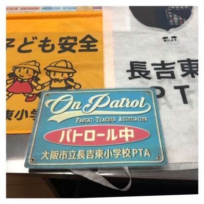 これは、長吉東小学校のPTAが、作ったビブスと、はたと、自転車につけるプレートです。