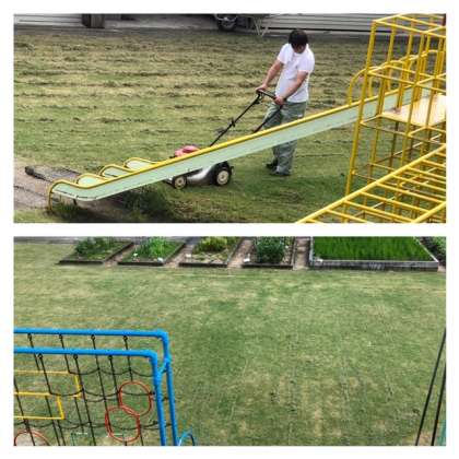 ニコヒロの芝生をきれいに刈り取っています。