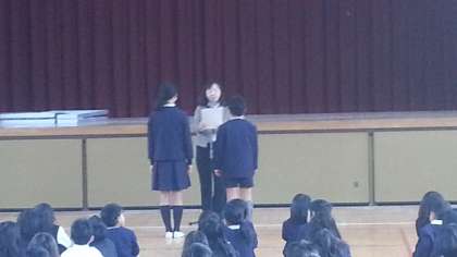 寒さが厳しくなった中、講堂で児童朝会を行いました。